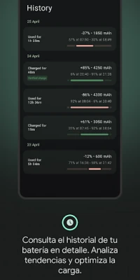 Sumérgete en el monitoreo avanzado de la salud de tu batería. Podrás observar cómo evoluciona su capacidad real en mAh y el porcentaje de salud a lo largo del tiempo, comprendiendo el impacto del desgaste por ciclos de carga. Battery Guru también registra las temperaturas máximas alcanzadas durante las sesiones de recarga, información crucial para el cuidado a largo plazo. Además, desglosa las estadísticas de uso: identifica aplicaciones que consumen más energía, analiza tendencias diarias de consumo y monitoriza el rendimiento tanto en actividad como en reposo, incluso detectando las activaciones desde el modo de suspensión profunda.