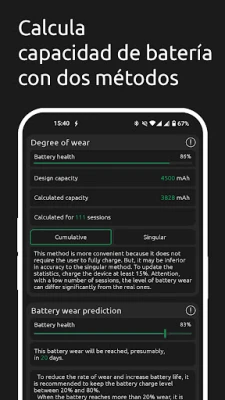 Con Battery One, te sumergirás en una analítica detallada que va más allá de lo superficial. Un algoritmo único analiza colectivamente cada sesión de carga para desvelar la capacidad real de tu batería con una precisión asombrosa. Monitoriza el flujo energético, accede a un historial de uso exhaustivo y anticipa la duración restante con predicciones inteligentes. Además, su función experimental de pronóstico de desgaste, basada en algoritmos avanzados, te ofrece una visión exclusiva sobre el futuro rendimiento de tu batería, permitiéndote tomar decisiones informadas sobre su cuidado.